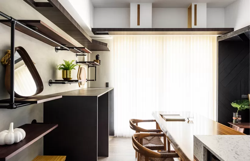 一進門設置一張超大原木桌板,作為客廳的序曲,搭配水磨石桌面,與原木桌板旁的茶具台,相互輝映